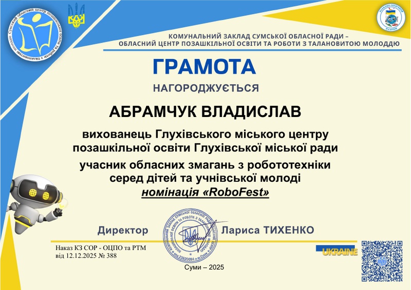 У грудні 2025 року відбулися обласні змагання (онлайн) з робототехніки серед дітей та учнівської молоді – масштабний захід, метою якого є розвиток інноваційних напрямів STEM-освіти та популяризація науково-технічної творчості. Організатором заходу був комунальний заклад Сумської обласної ради – обласний центр позашкільної освіти та роботи з талановитою молоддю.